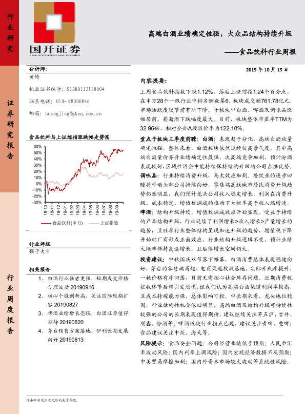 【国开证券】【20191015】20191015-国开证券-食品饮料行业周报:高端白酒业绩确定性强,大众品结构持续升级-9页