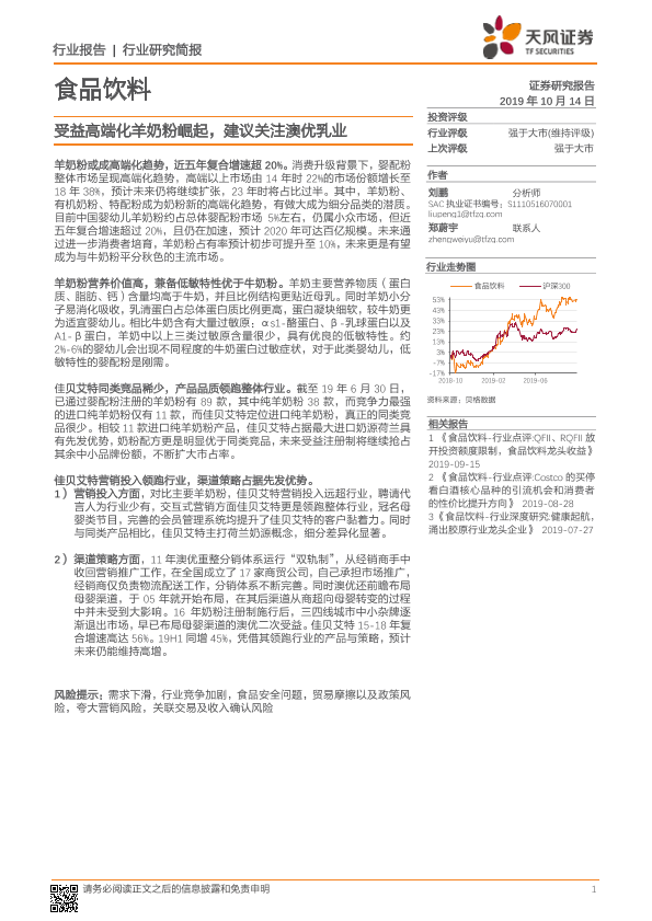 【天风证券】【20191014】食品饮料行业研究简报:受益高端化羊奶粉崛起,建议关注澳优乳业-12页