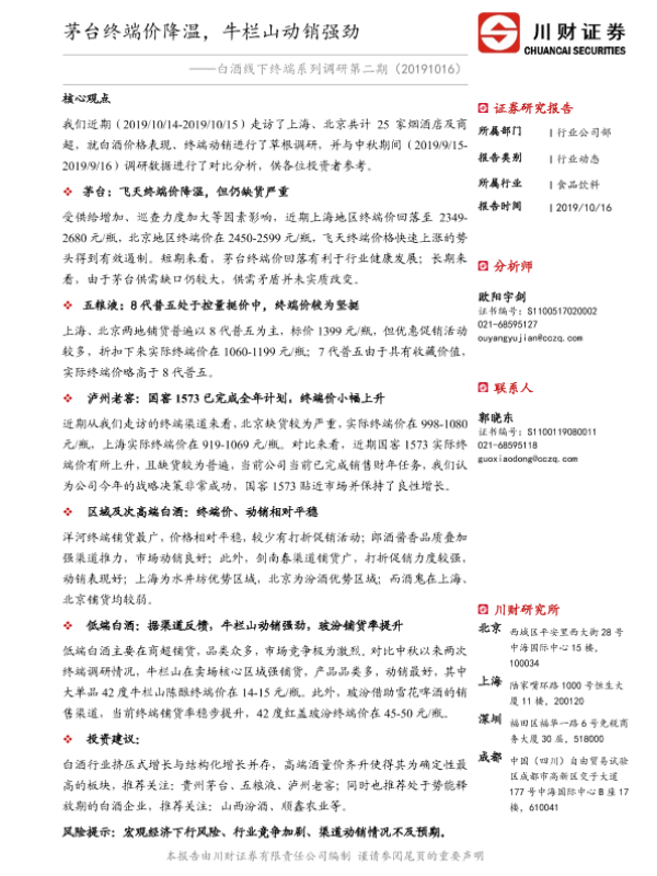 【川财证券】【20191016】白酒线下终端系列调研第二期:茅台终端价降温,牛栏山动销强劲-17页