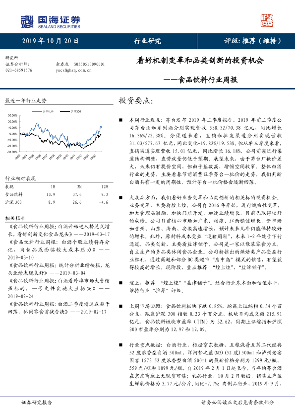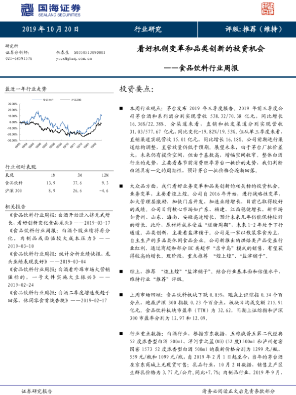 【国海证券】【20191020】20191020-国海证券-食品饮料行业周报:看好机制变革和品类创新的投资机会-22页