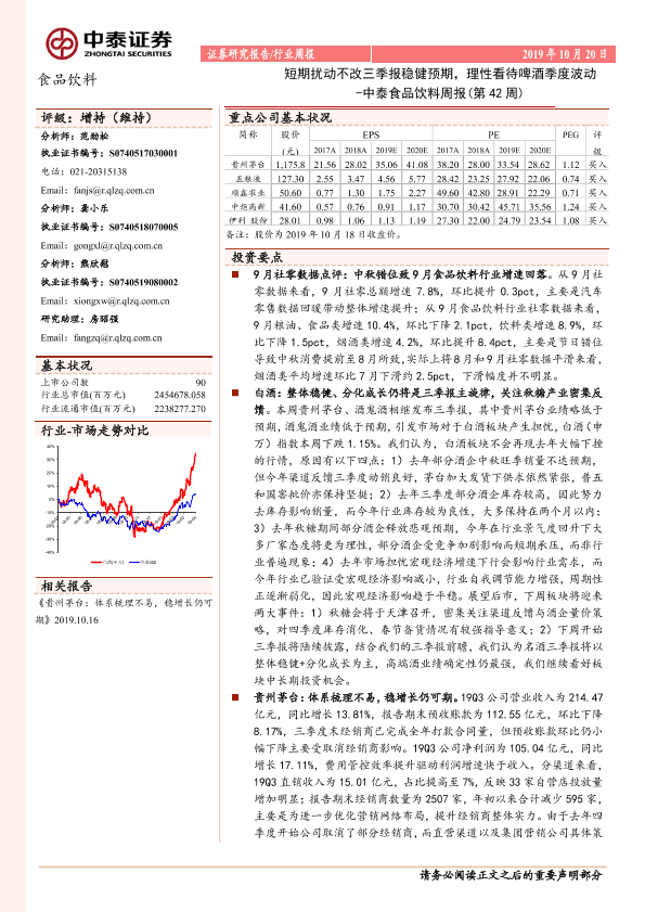 【中泰证券】【20191020】中泰食品饮料周报(第42周):短期扰动不改三季报稳健预期,理性看待啤酒季度波动-8页