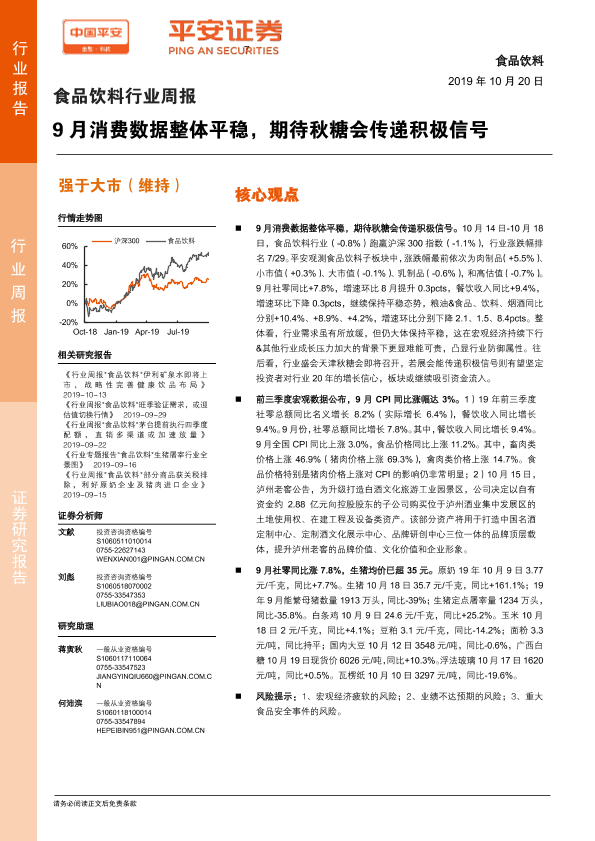 【平安证券】【20191020】食品饮料行业周报:9月消费数据整体平稳,期待秋糖会传递积极信号-6页