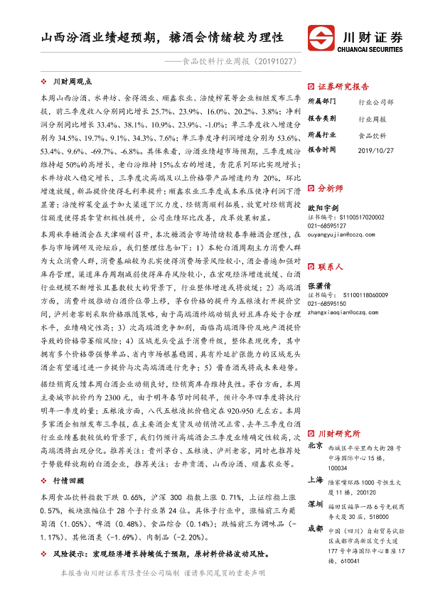 【川财证券】【20191027】食品饮料行业周报:山西汾酒业绩超预期,糖酒会情绪较为理性-15页