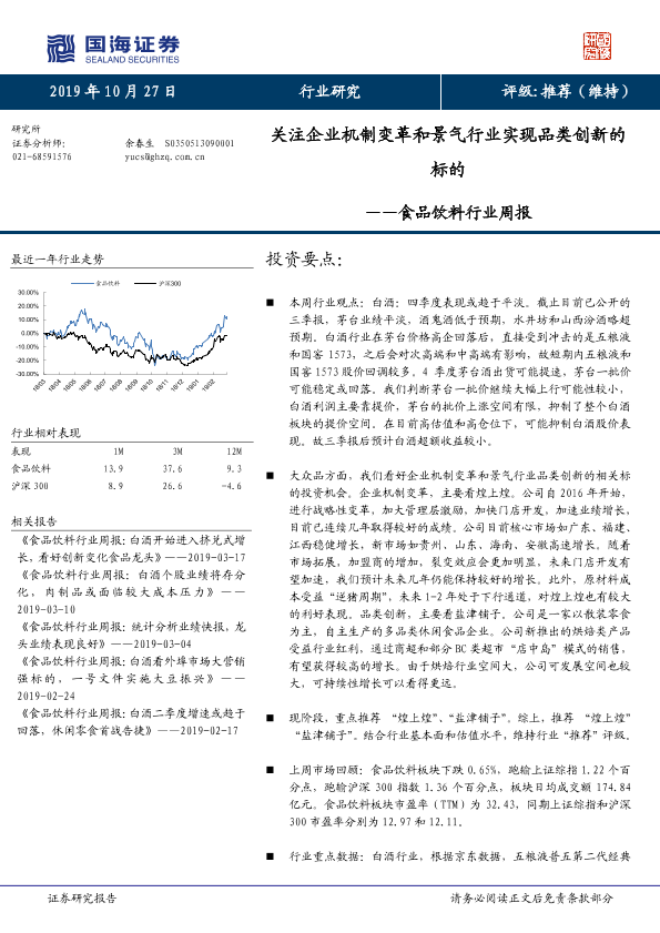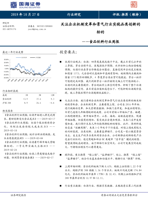 【国海证券】【20191027】食品饮料行业周报:关注企业机制变革和景气行业实现品类创新的标的-23页