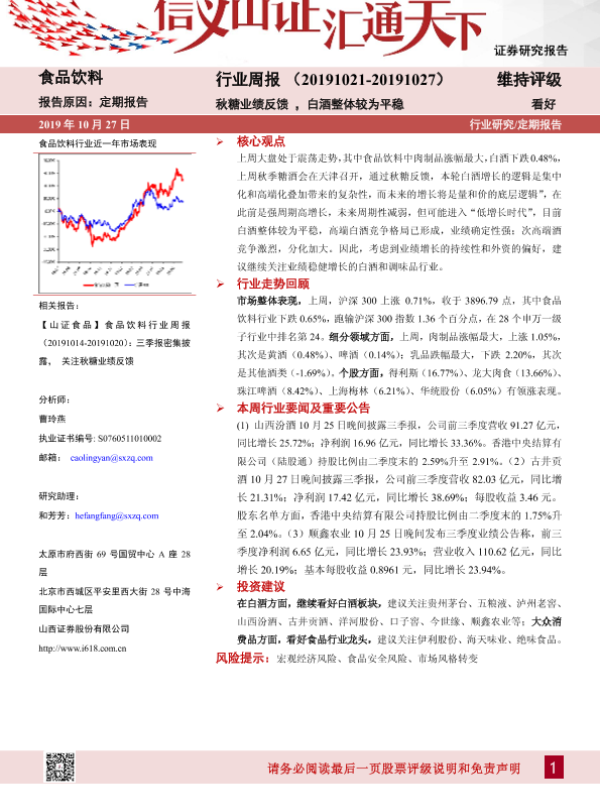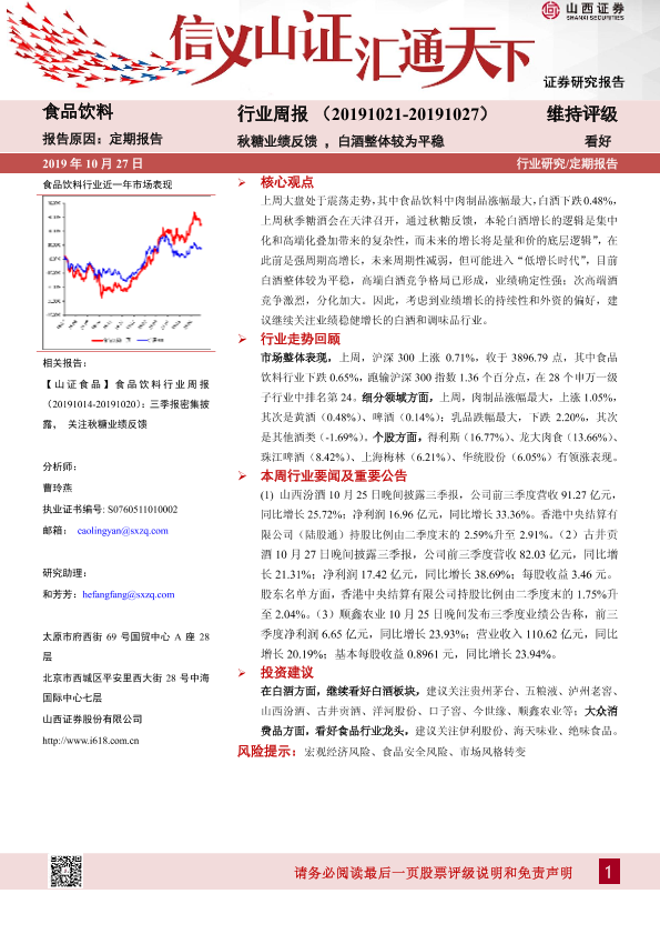 【山西证券】【20191027】食品饮料行业周报:秋糖业绩反馈,白酒整体较为平稳-10页