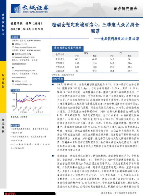 【长城证券】【20191028】食品饮料周报2019第42期:糖酒会坚定高端酒信心,三季度大众品持仓回落-15页