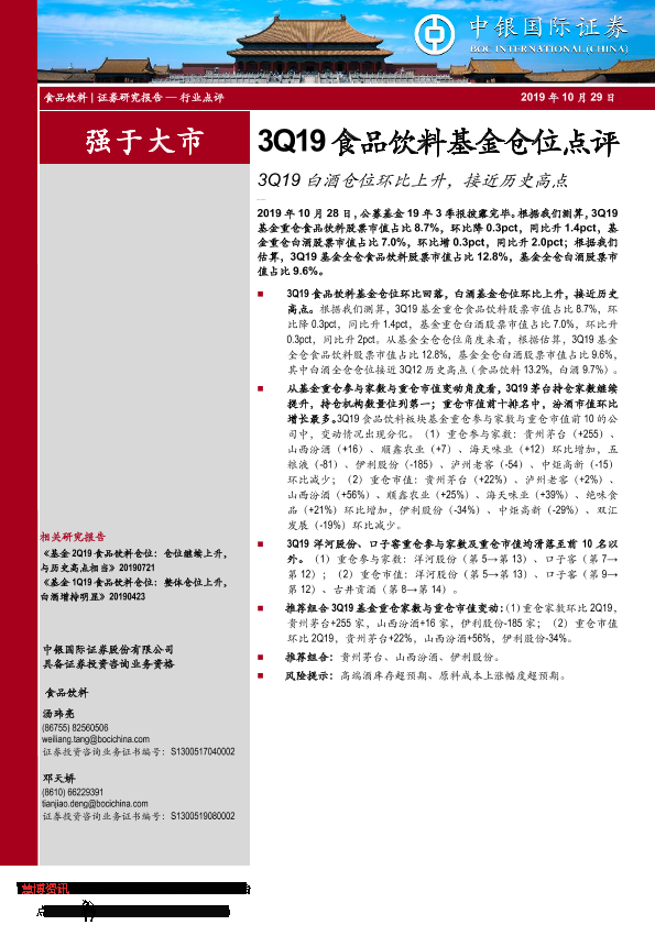 【中银证券】【20191029】3Q19食品饮料基金仓位点评:3Q19白酒仓位环比上升,接近历史高点-7页