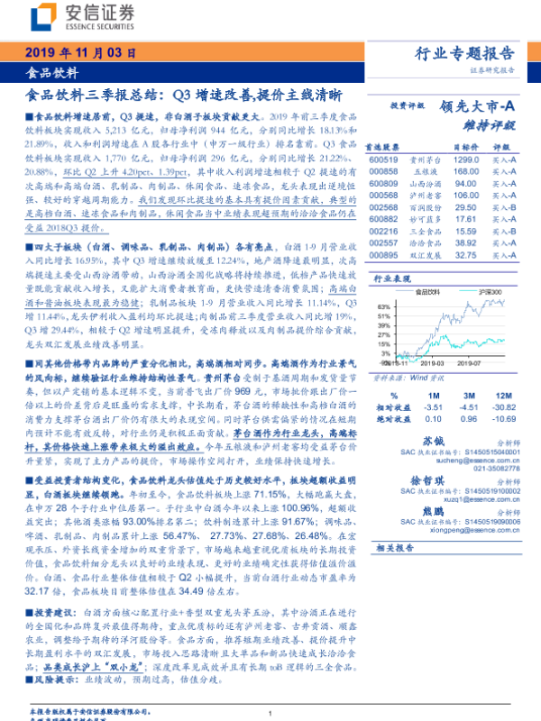 【安信证券】【20191103】食品饮料三季报总结:Q3增速改善,提价主线清晰-20页