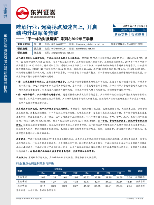 【东兴证券】【20191104】“不一样的财报解读”系列之2019年三季报:啤酒行业:远离拐点加速向上,开启结构升级军备竞赛-9页