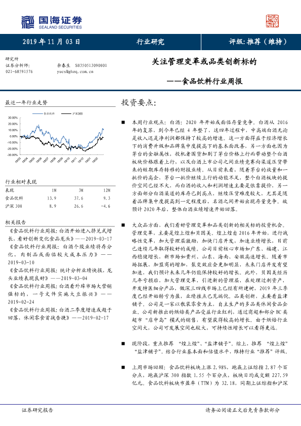 【国海证券】【20191103】食品饮料行业周报:关注管理变革或品类创新标的-22页