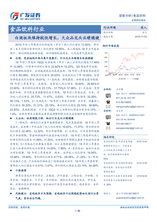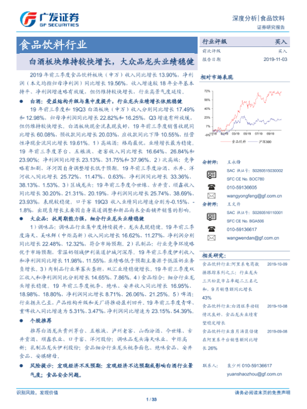 【广发证券】【20191103】食品饮料行业深度分析:白酒板块维持较快增长,大众品龙头业绩稳健-33页