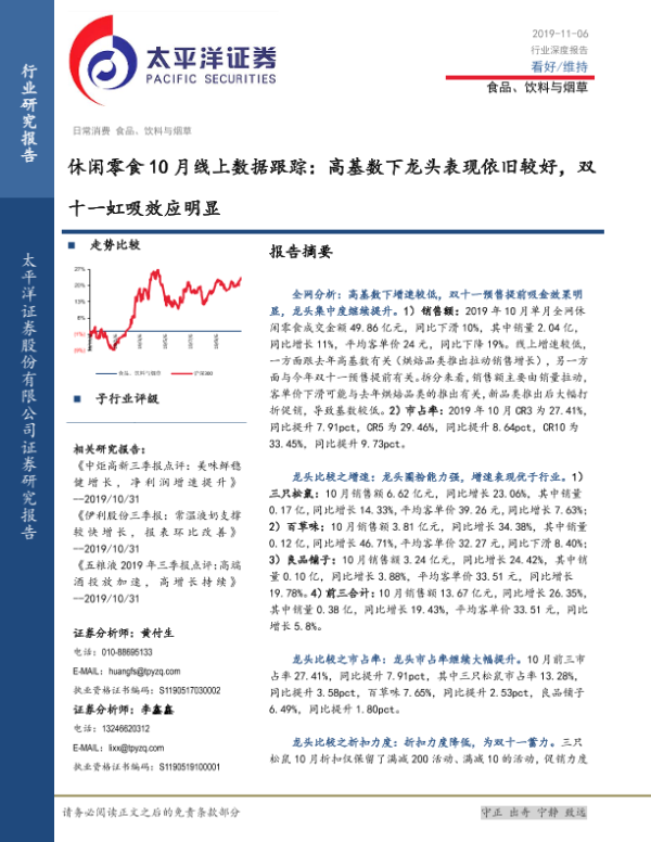 【太平洋证券】【20191106】20191106-太平洋-休闲零食10月线上数据跟踪:高基数下龙头表现依旧较好,双十一虹吸效应明显-8页