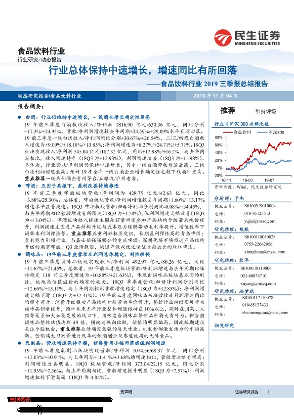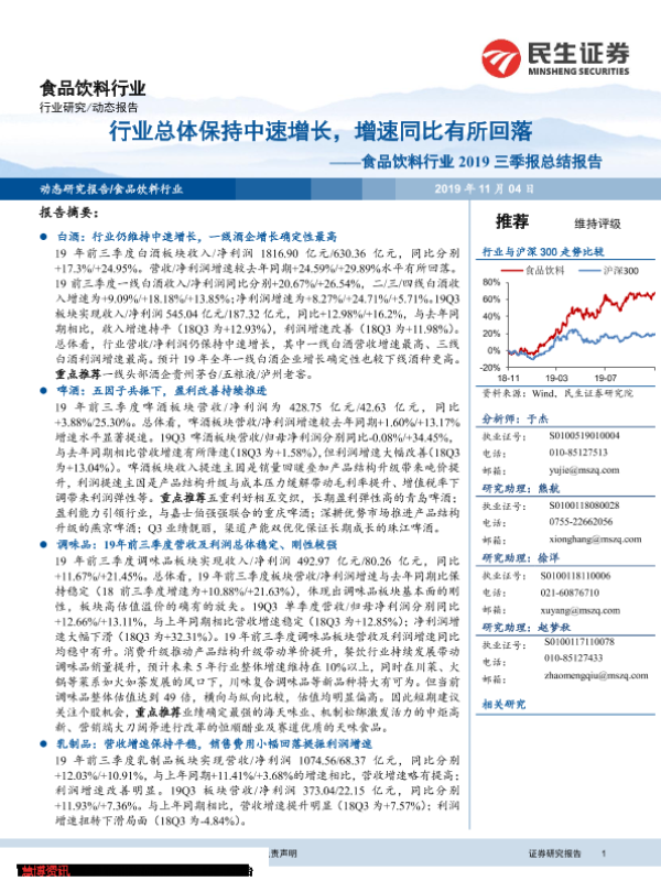 【民生证券】【20191104】食品饮料行业2019三季报总结报告:行业总体保持中速增长,增速同比有所回落-31页