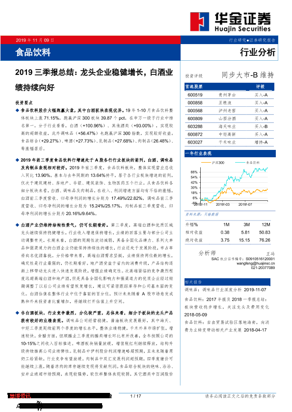 【华金证券】【20191109】食品饮料2019三季报总结:龙头企业稳健增长,白酒业绩持续向好-17页