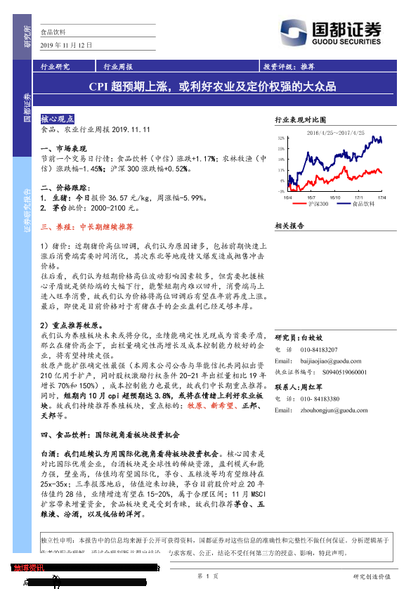 【国都证券】【20191112】食品饮料行业周报:CPI超预期上涨,或利好农业及定价权强的大众品-3页