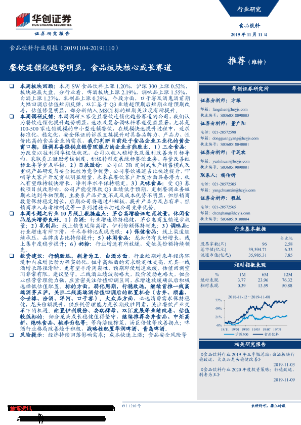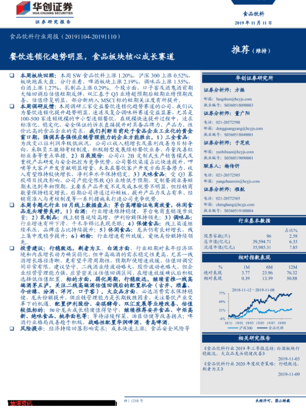【华创证券】【20191111】食品饮料行业周报:餐饮连锁化趋势明显,食品板块核心成长赛道-24页