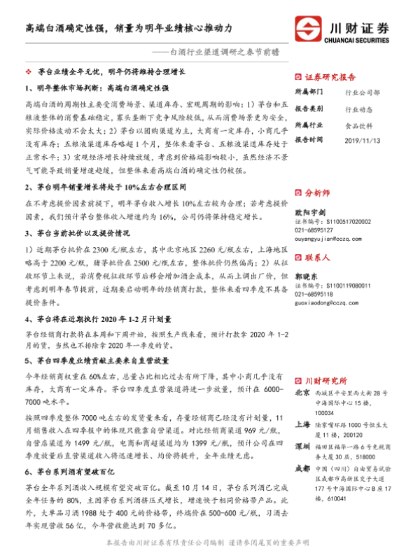 【川财证券】【20191113】白酒行业渠道调研之春节前瞻:高端白酒确定性强,销量为明年业绩核心推动力-4页