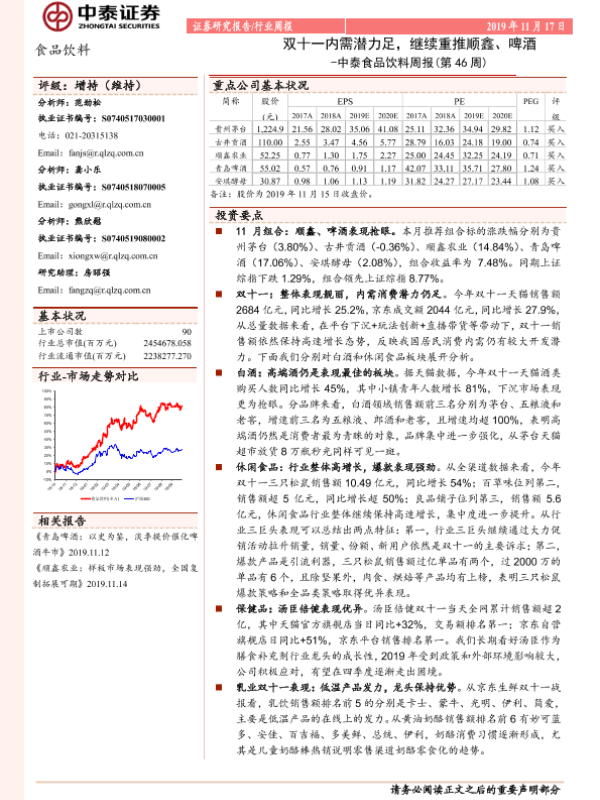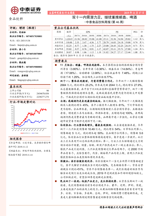 【中泰证券】【20191117】中泰食品饮料周报(第46周):双十一内需潜力足,继续重推顺鑫、啤酒-10页