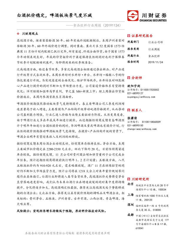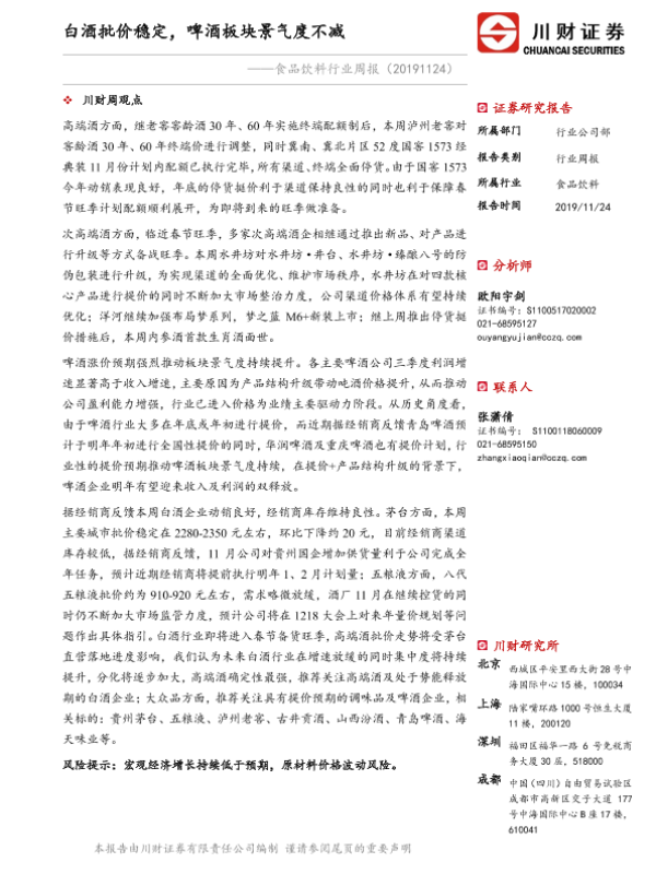 【川财证券】【20191124】食品饮料行业周报:白酒批价稳定,啤酒板块景气度不减-14页