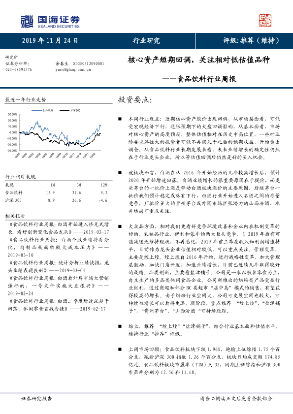 【国海证券】【20191124】食品饮料行业周报:核心资产短期回调,关注相对低估值品种-20页