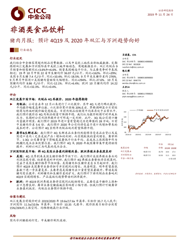 【中金公司】【20191124】20191124-中金公司-猪肉月报:预计4Q19及2020年双汇与万洲趋势向好-15页