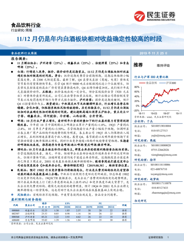 【民生证券】【20191125】20191125-民生证券-食品饮料行业周报:11 12月仍是年内白酒板块相对收益确定性较高的时段-20页