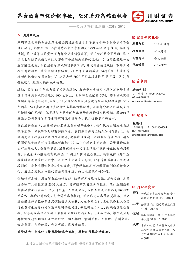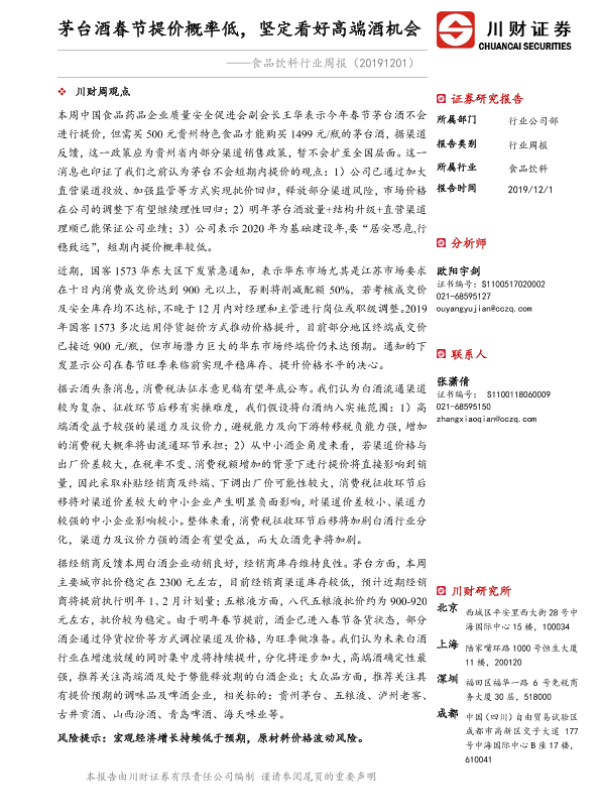 【川财证券】【20191201】食品饮料行业周报:茅台酒春节提价概率低,坚定看好高端酒机会-14页