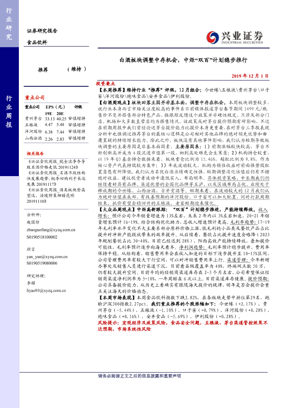 【兴业证券】【20191201】20191201-兴业证券-食品饮料行业周报:白酒板块调整中存机会,中炬“双百”计划稳步推行-16页