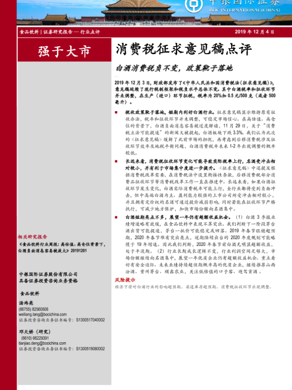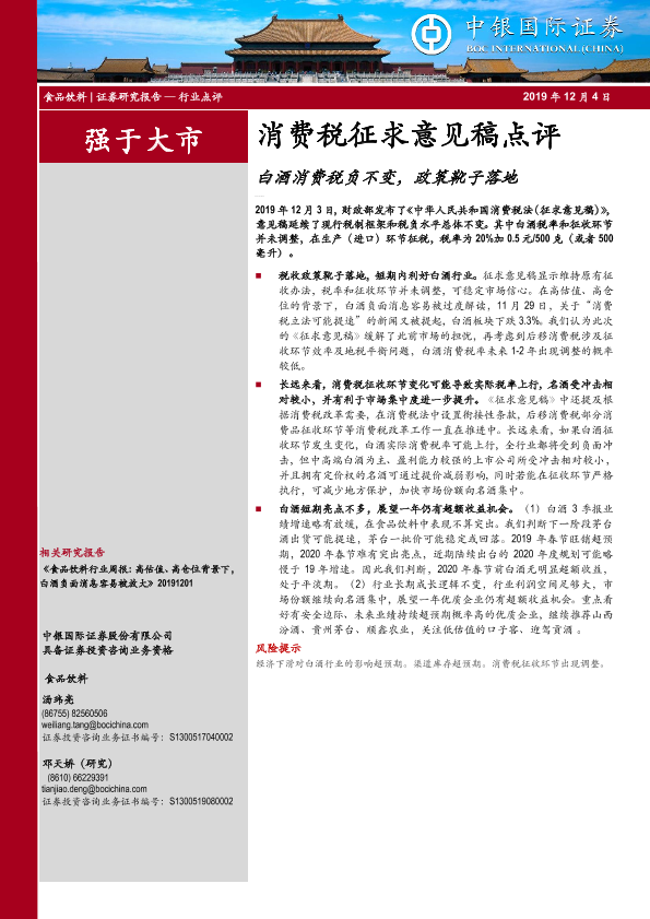 【中银证券】【20191204】食品饮料行业消费税征求意见稿点评:白酒消费税负不变,政策靴子落地-4页