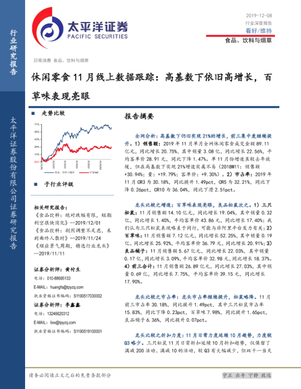 【太平洋证券】【20191208】休闲零食11月线上数据跟踪:高基数下依旧高增长,百草味表现亮眼-8页