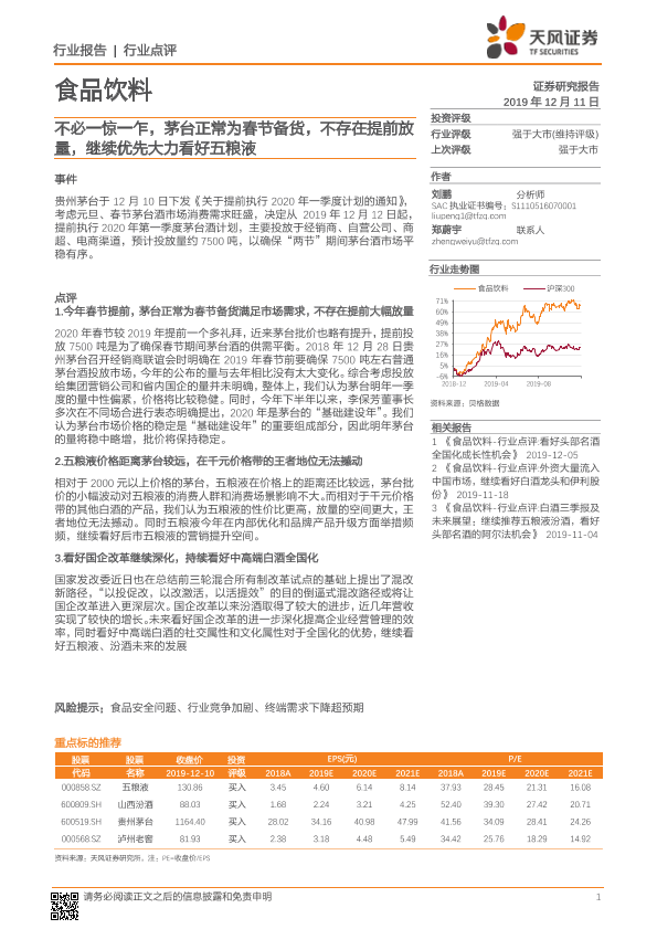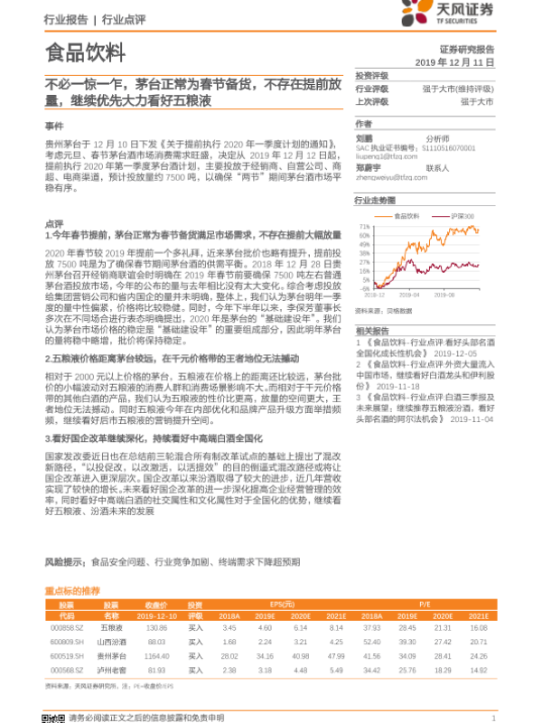【天风证券】【20191211】食品饮料行业点评:不必一惊一乍,茅台正常为春节备货,不存在提前放量,继续优先大力看好五粮液-2页