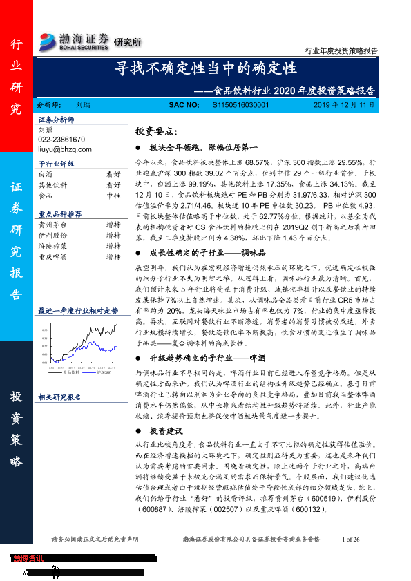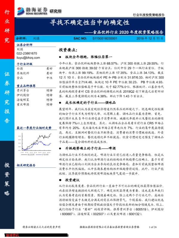 【渤海证券】【20191211】食品饮料行业2020年度投资策略报告:寻找不确定性当中的确定性-26页