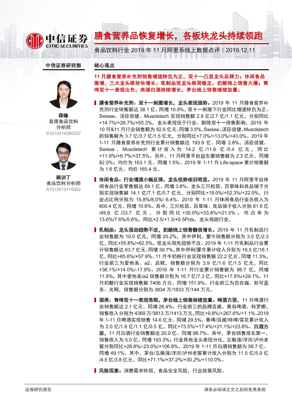 【中信证券】【20191211】食品饮料行业2019年11月阿里系线上数据点评:膳食营养品恢复增长,各板块龙头持续领跑-10页
