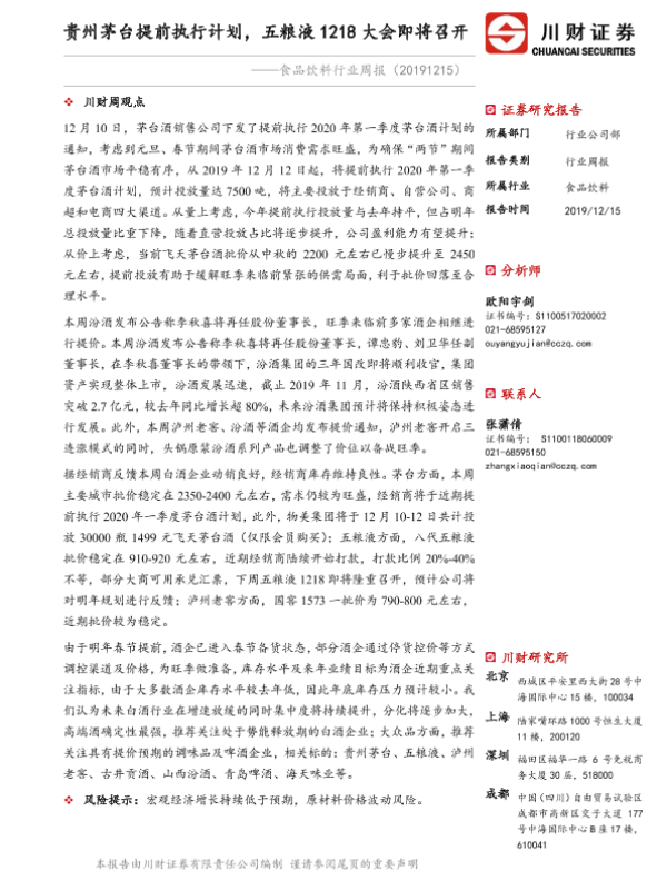 【川财证券】【20191215】食品饮料行业周报:贵州茅台提前执行计划,五粮液1218大会即将召开-16页