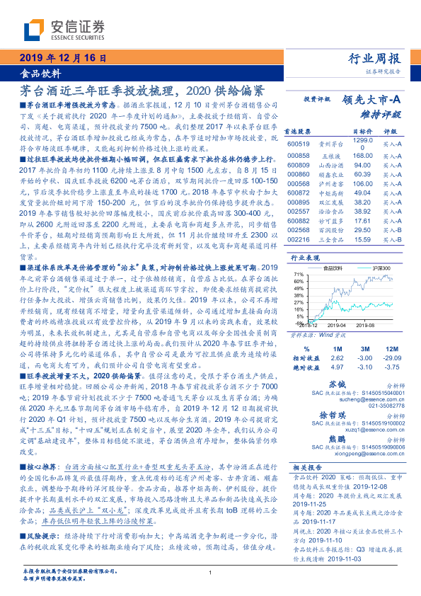 【安信证券】【20191216】食品饮料行业周报:茅台酒近三年旺季投放梳理 2020供给偏紧-21页