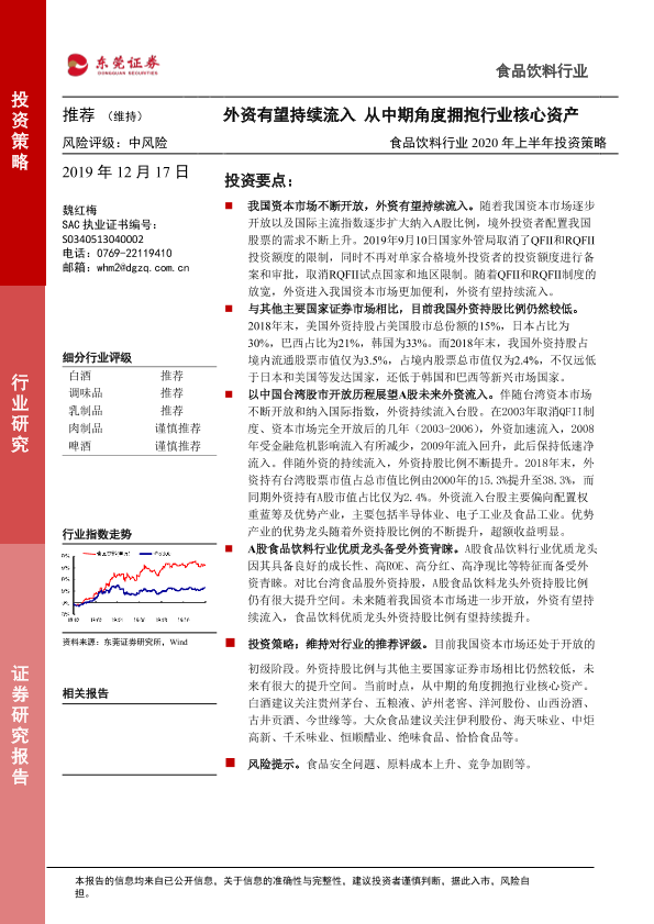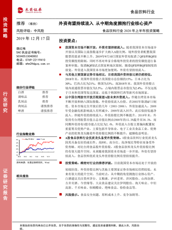【东莞证券】【20191217】食品饮料行业2020年上半年投资策略:外资有望持续流入 从中期角度拥抱行业核心资产-22页