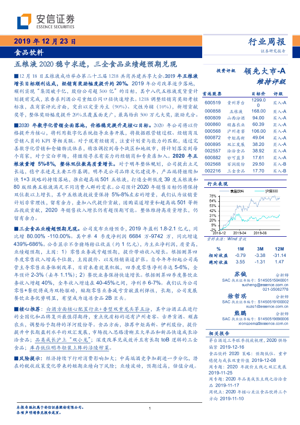 【安信证券】【20191223】20191223-安信证券-食品饮料行业周报:五粮液2020稳中求进,三全食品业绩超预期兑现-21页