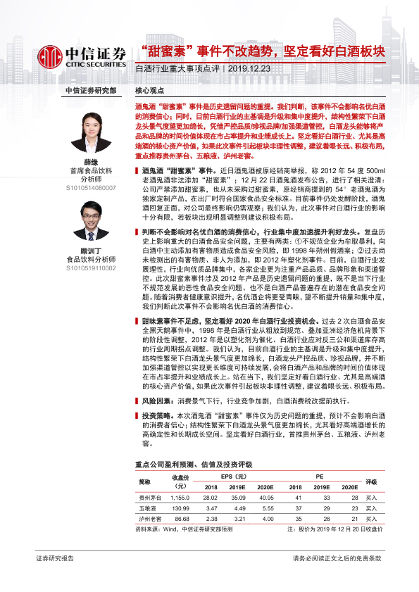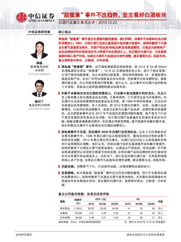 【中信证券】【20191223】白酒行业重大事项点评:“甜蜜素”事件不改趋势,坚定看好白酒板块-2页