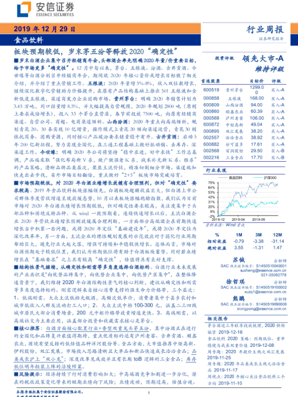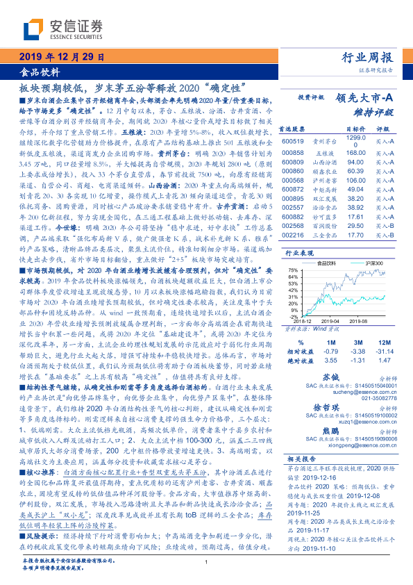 【安信证券】【20191229】食品饮料行业周报:板块预期较低,岁末茅五汾等释放2020“确定性”-20页
