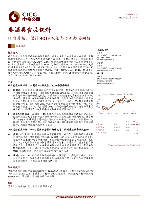 【中金公司】【20191226】20191226-中金公司-猪肉月报:预计4Q19双汇与万洲趋势向好-15页