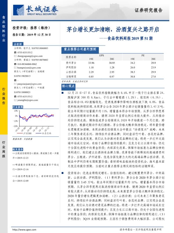 【长城证券】【20191230】20191230-长城证券-食品饮料周报2019第51期:茅台增长更加清晰,汾酒复兴之路开启-11页