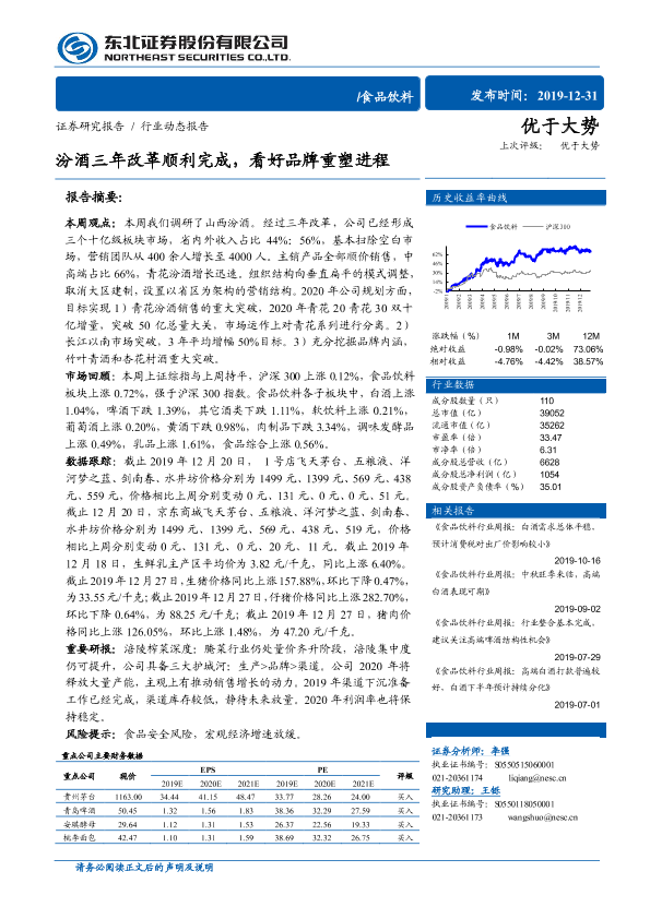 【东北证券】【20191231】汾酒三年改革顺利完成,看好品牌重塑进程-12页