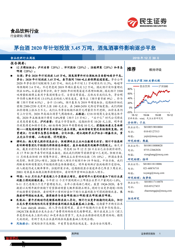 【民生证券】【20191230】20191230-民生证券-食品饮料行业周报:茅台酒2020年计划投放3.45万吨,酒鬼酒事件影响逐步平息-26页