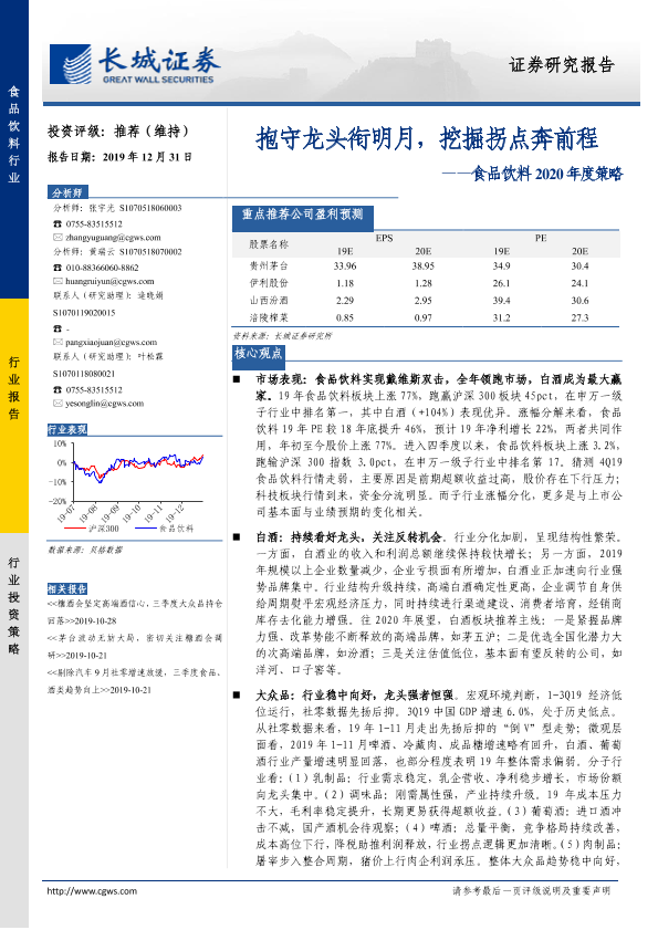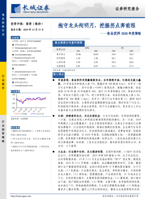 【长城证券】【20191231】20191231-长城证券-食品饮料2020年度策略:抱守龙头衔明月,挖掘拐点奔前程-47页