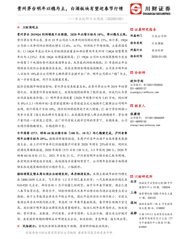 【川财证券】【20200105】食品饮料行业周报:贵州茅台明年以稳为主,白酒板块有望迎春节行情-15页