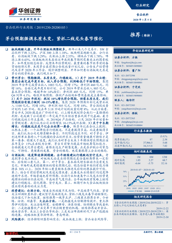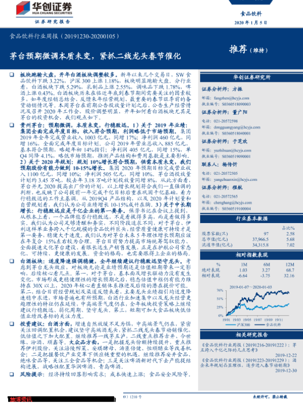 【华创证券】【20200105】20200105-华创证券-食品饮料行业周报:茅台预期微调本质未变,紧抓二线龙头春节催化-22页