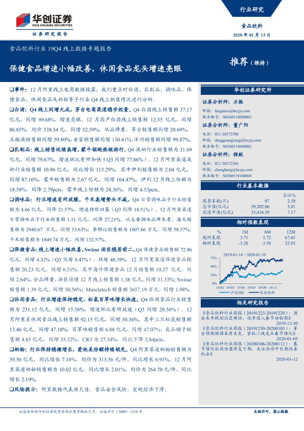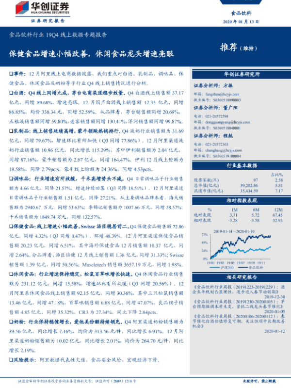 【华创证券】【20200113】食品饮料行业19Q4线上数据专题报告:保健食品增速小幅改善,休闲食品龙头增速亮眼-20页