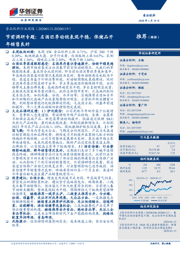 【华创证券】【20200119】食品饮料行业周报:节前调研专题:名酒旺季动销表现平稳,保健品开年销售良好-23页