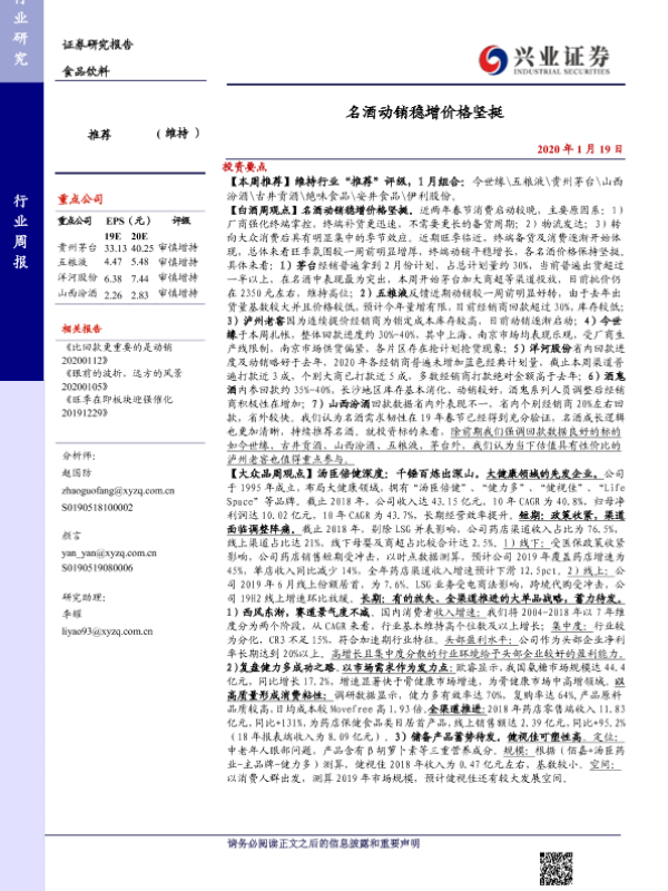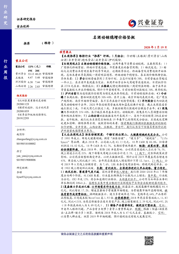 【兴业证券】【20200119】20200119-兴业证券-食品饮料行业周报:名酒动销稳增价格坚挺-17页