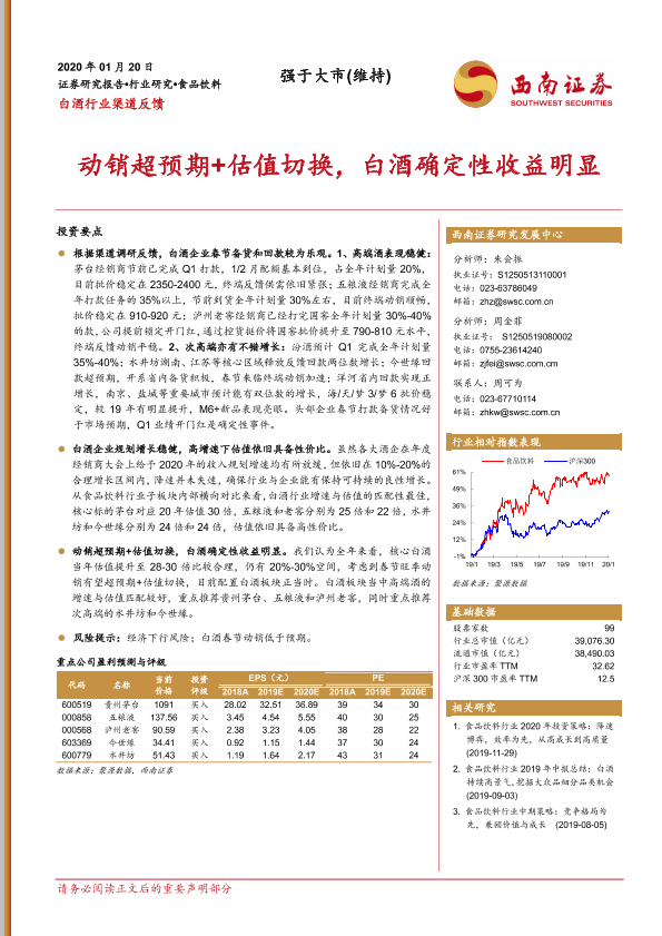 【西南证券】【20200120】白酒行业渠道反馈:动销超预期+估值切换,白酒确定性收益明显-10页
